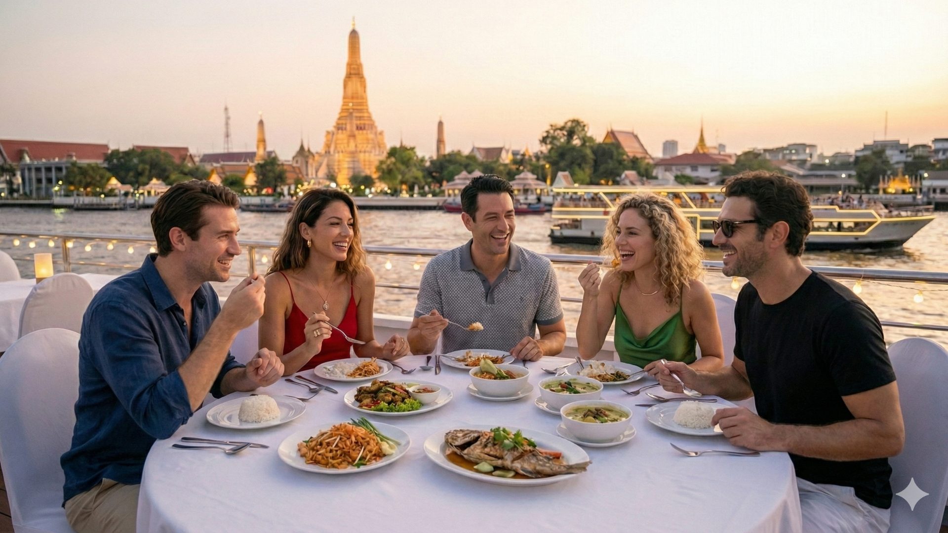 הנהר הוא הלב הפועם של בנגקוק וכשהשמש שוקעת הוא הופך למסלול של אורות וזהב. שייט ארוחת ערב הוא לא רק ארוחה אלא רגע שבו העיר נחשפת בשיא תפארתה מול העיניים והרוח המלטפת של הלילה מוסיפה תחושה של חופש אמיתי. ​עבור משפחות מדובר ברגע של נחת בתוך הקצב המהיר של תאילנד. הילדים מרגישים כמו במסע הרפתקאות על המים וההורים זוכים לשקט כשהמראות של המקדשים המוארים משאירים את כולם מוקסמים. המגוון העצום בבופה מבטיח שכל אחד ימצא את הטעם שלו בתוך החגיגה הזו ללא צורך בהתרוצצות ברחובות העמוסים. ​לחברים השייט הוא הבמה המושלמת ללילה של צחוק וחיבור. המוזיקה החיה והאורות המשתקפים במים יוצרים תפאורה של סרט צבעוני. זה הזמן להרים כוסית מול וואט ארון המואר וליהנות מהעוצמה של המטרופולין מזווית שרק הנהר יכול להציע מה שהופך כל תמונה לזיכרון בלתי נשכח שכולם ינצרו. ​לקבוצות השייט מעניק תחושה של אירוע חגיגי ויוקרתי בלב העיר. המרחב הגדול מאפשר לכולם לשבת יחד ולחלוק את החוויה כאיש אחד מסביב לשולחנות ארוכים ומפוארים. זהו שילוב נדיר של הנאה ונוחות שגורם לכל משתתף להרגיש מיוחד תוך כדי שהעיר המוארת חולפת על פניהם באיטיות מהפנטת.